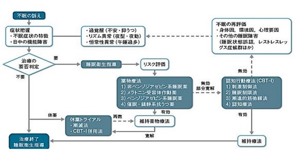 薬物療法を開始する前に ①症状把握、②治療の要否判定、③睡眠衛生指導、④リスク評価のステップを踏むことが必要です。